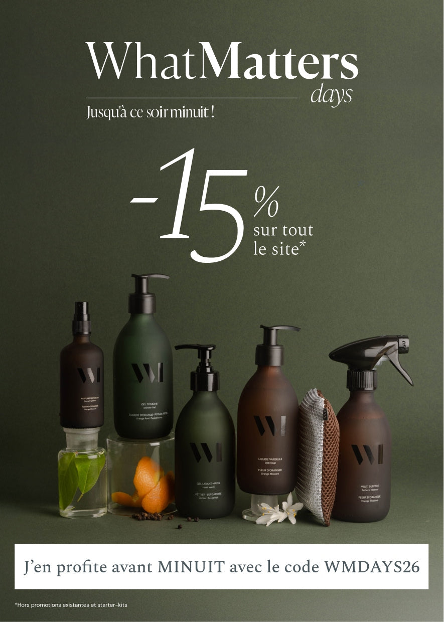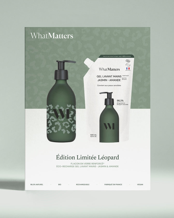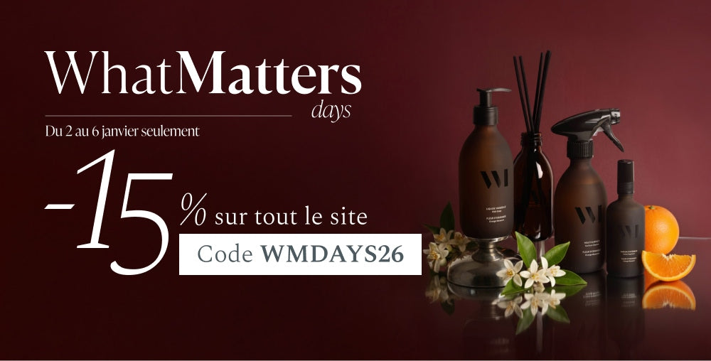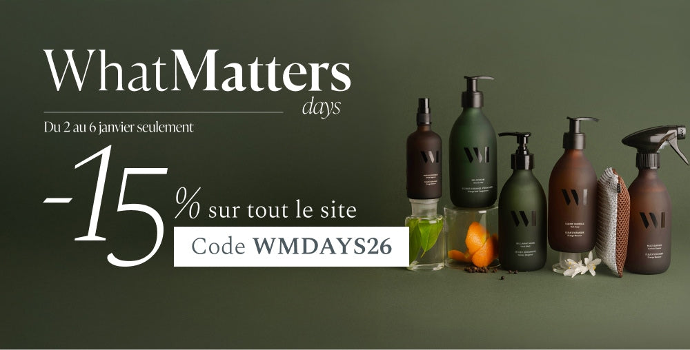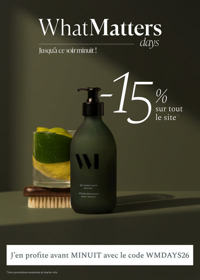 What Matters a pour ambition de ré-enchanter les essentiels du quotidien avec une gamme complète de produits de soin, d’hygiène et de la maison. Des produits certifiés bio et vegan, sensoriels et efficaces dans de jolis flacons en verre renforcé® et rechargeables, le tout 100 % fabriqué en France (formules et packagings). Une gamme sans compromis, permettant de réconcilier la confiance, le plaisir, la simplicité, le beau et l'écologie.